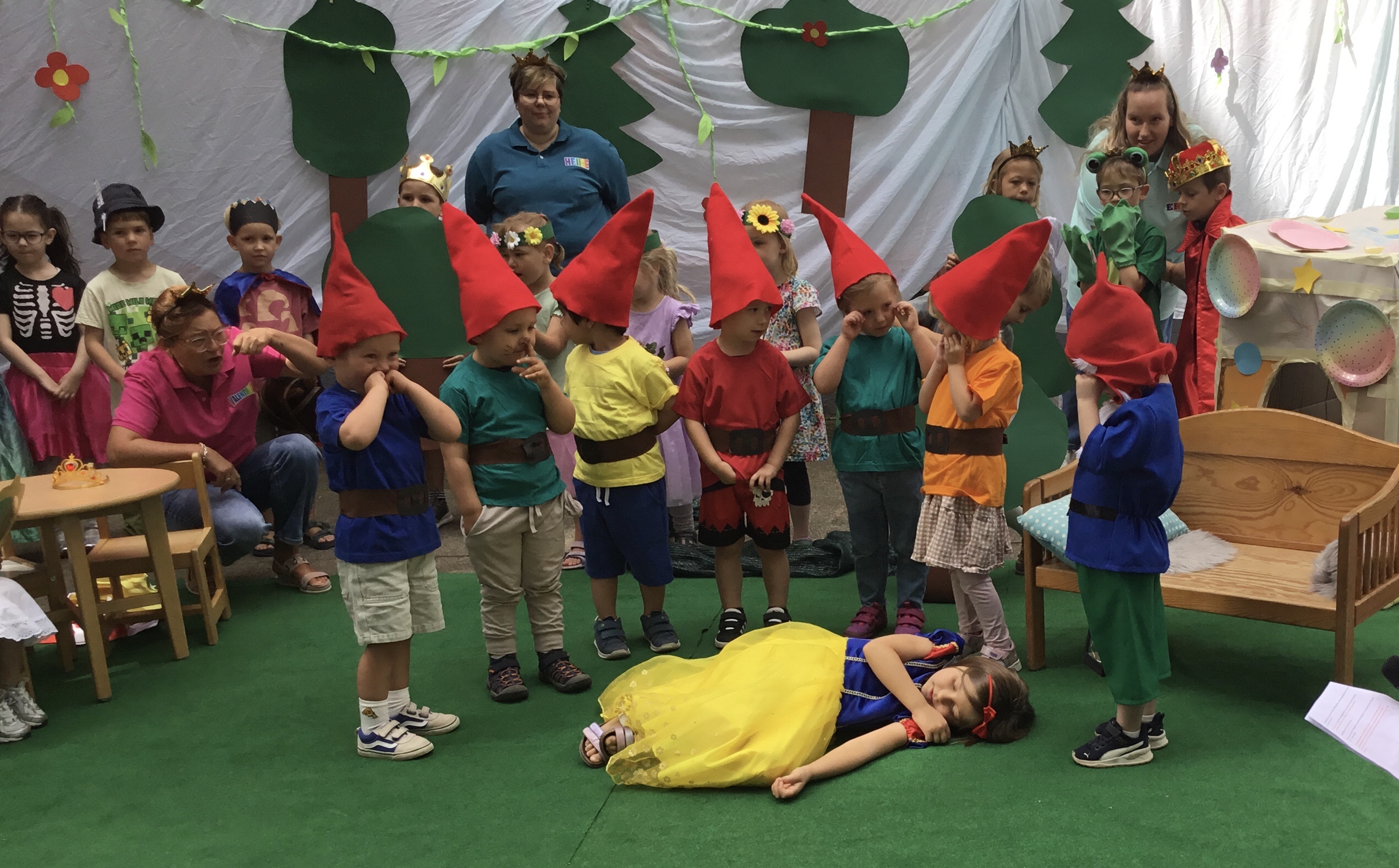 Die Kinder hatten dazu auf der Bühne eine erlesene Auswahl an 4 Märchen vorgespielt und gesungen. Dabei haben die Kinder ihre Rollen mit Inbrunst dargestellt und gesprochen.